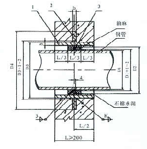 5、Ⅱ型套管穿墻處之墻壁,如遇非混凝土墻壁時應改用混凝土墻壁,其澆注混凝土范圍,Ⅱ型套管應比翼環直徑(D4)大200mm,而且必須將套管一次澆固于墻內。套管內的填料應緊密搗實。