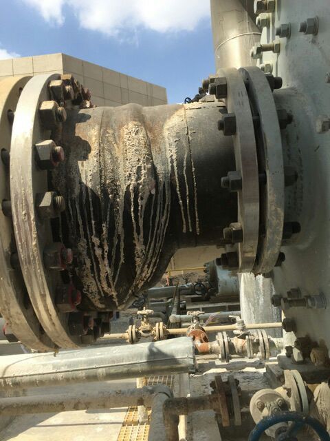 偏心和同心橡膠接頭皆為三元乙丙橡膠生產(chǎn),耐壓20公斤,316L不銹鋼法蘭,用戶使用的環(huán)境為化工行業(yè),水樣催化劑的介質(zhì),常理來(lái)說(shuō),這類介質(zhì),對(duì)橡膠球體本身并不會(huì)造成什么影響,為什么橡膠接頭會(huì)開(kāi)裂呢?通過(guò)圖片情況我們可以看到,橡膠球體外部膠層開(kāi)裂內(nèi)部并無(wú)泄露現(xiàn)象,這種情況一般是由于壓力過(guò)大導(dǎo)致的,但用戶水泵打開(kāi)壓力又并未超出橡膠接頭承受壓力范圍,所以這一情況進(jìn)行排除,第二種原因就是由于生產(chǎn)問(wèn)題,內(nèi)外膠層貼合不嚴(yán)密的情況下,由于溫度影響造成內(nèi)外膠層分離,進(jìn)而橡膠接頭承壓能力減弱,在運(yùn)行過(guò)程中容易造成開(kāi)裂。